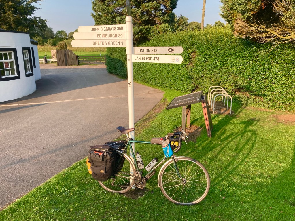 10 miles, with a brief glimpse of the Solway Firth, and a blast alongside the M6 later, and I’d finally returned to Scotland, crossing the border at Gretna Green and finding the Lejog ‘midpoint’ post.