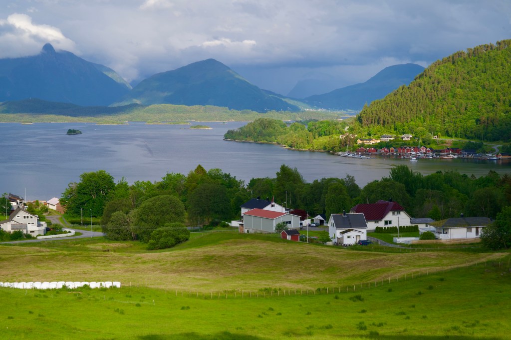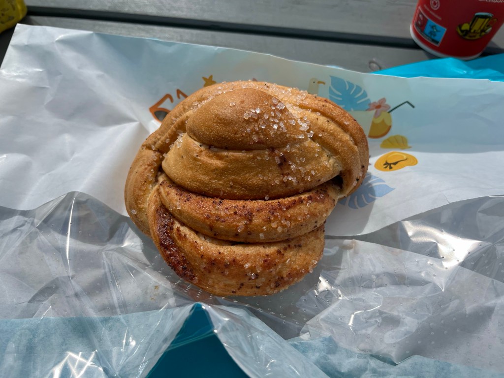 After I’d polished off the rest of the climb from Eide, I then dropped down to Vanylsfjorden, before stopping at the Joker shop in Åheim, availing myself of the free coffee. I also picked up a Kanelknute (cinnamon bun), surprisingly the first I’d seen in a supermarket since Oslo.