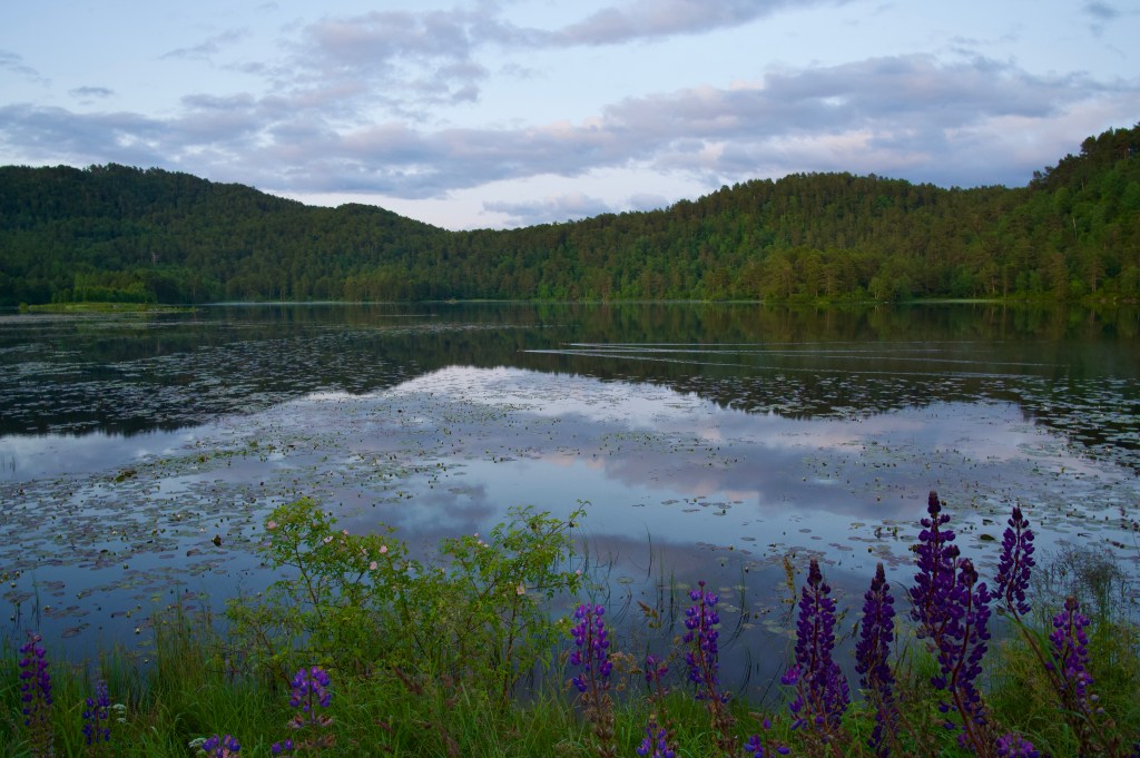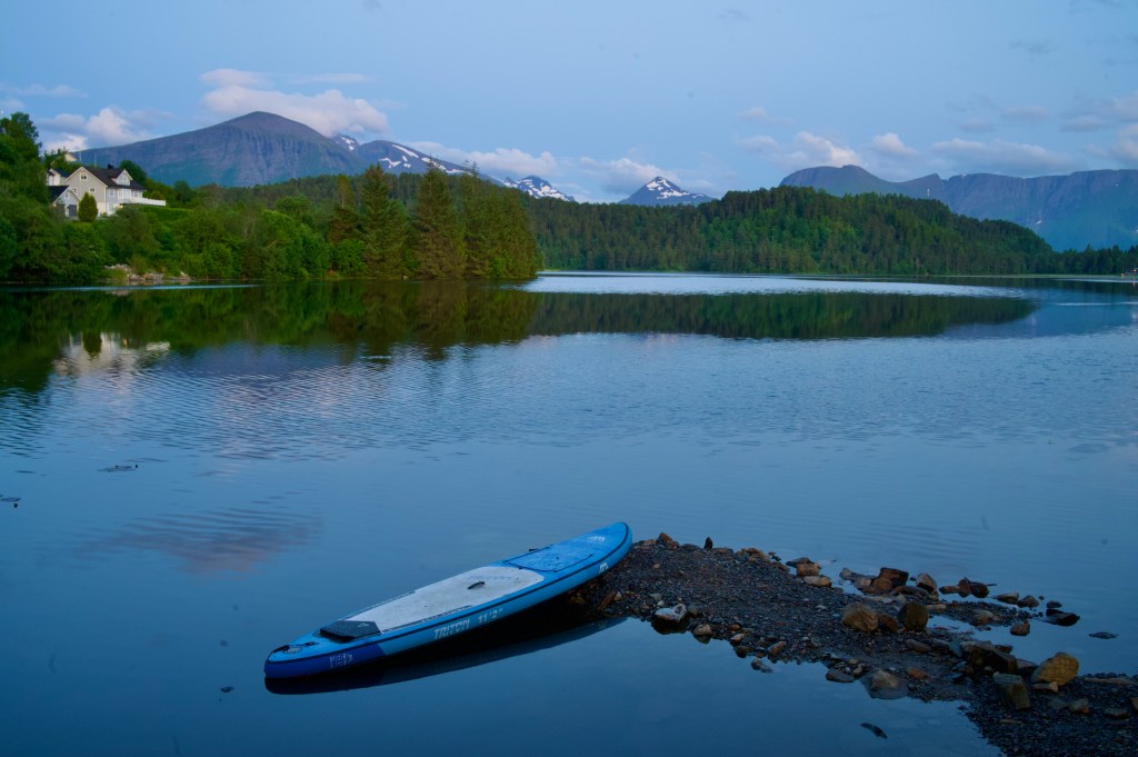 On exiting the ferry, I was dismayed at just how steeply the tree-covered landscape of Sulesund dropped to the sea, this was not the wild camping Mecca I’d been hoping for, but, 4 miles later, I was confronted by a stunning lake, and on its shore, a flat green haven, just waiting for a tent.