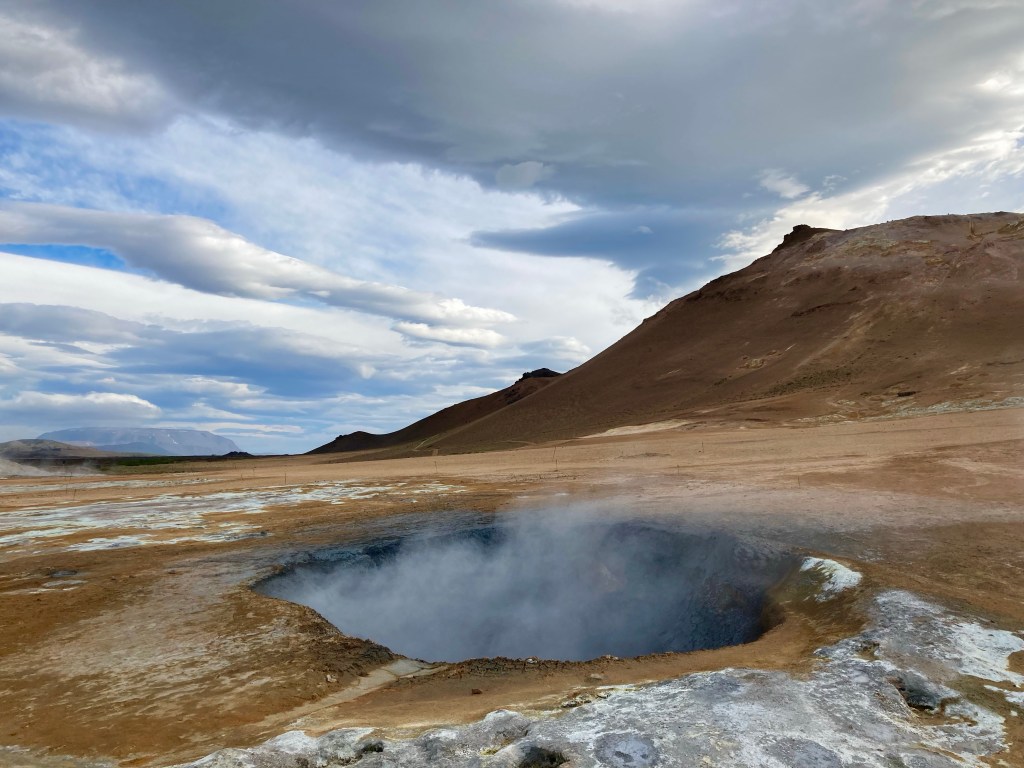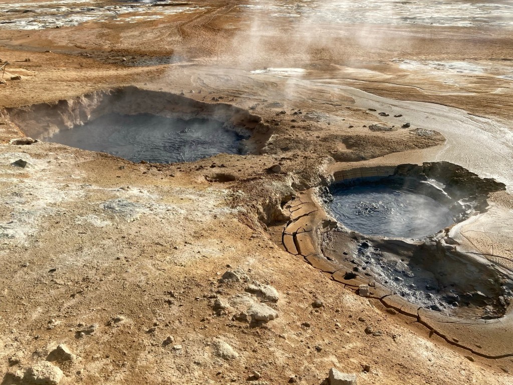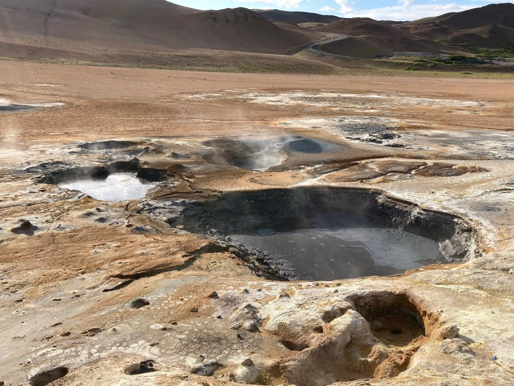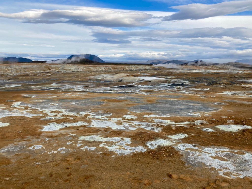 After 70 miles, I reached the outer confines of the Lake Myvatn geothermal area, following the hordes, my first stop was Hverir, a landscape littered with bubbling sulphurous mud pools.