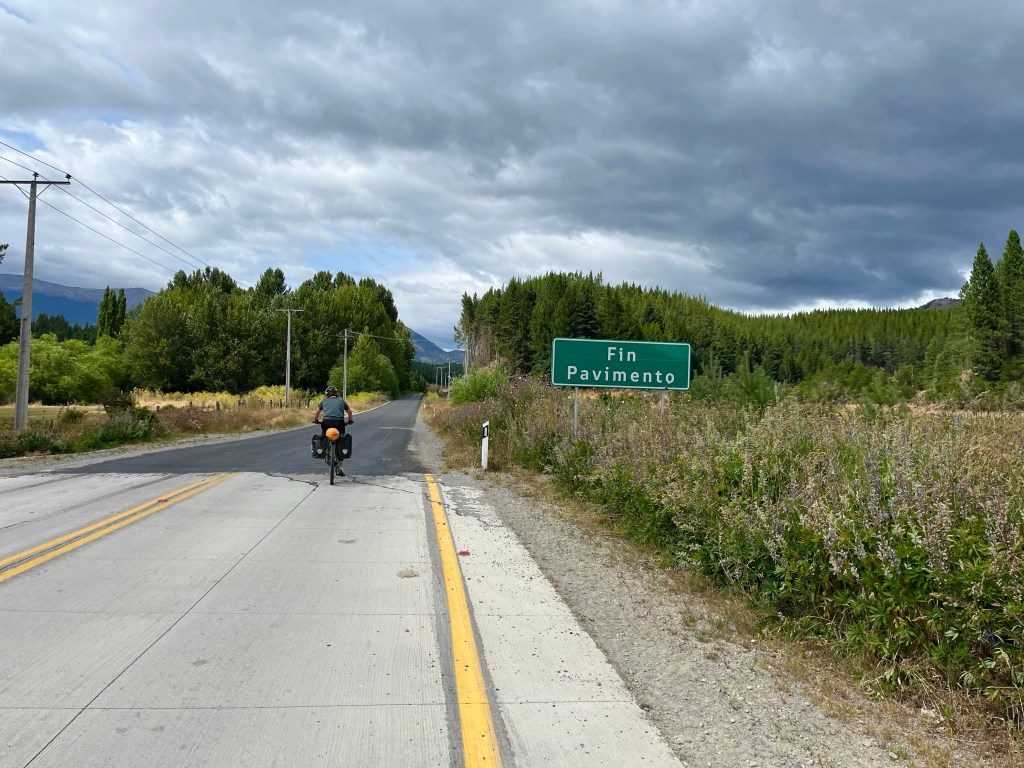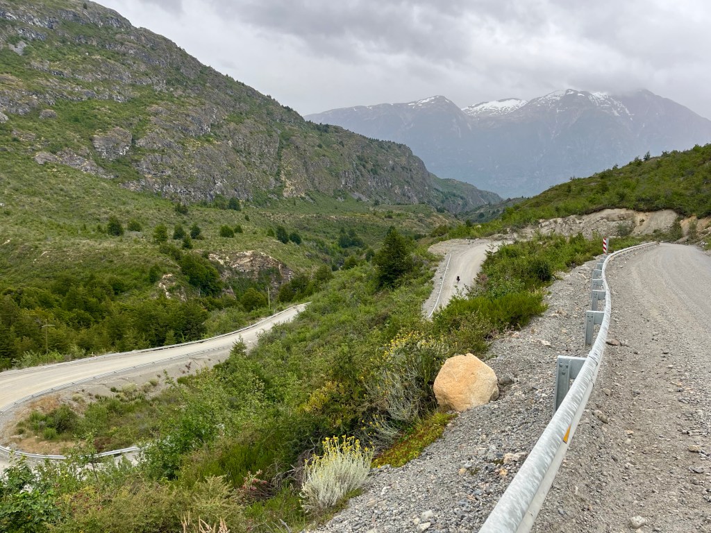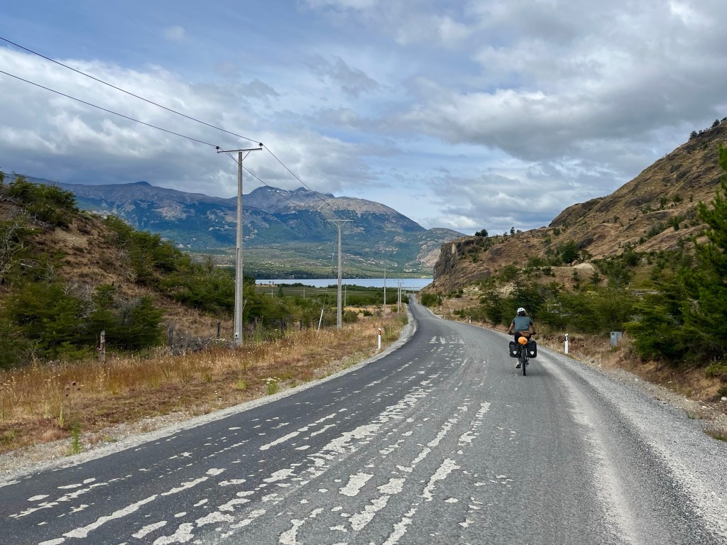 It was a wild day, with regular showers and a strong cool wind, thankfully blowing in a favourable direction. To combat the cold, I was wearing extra layers, but in turn, each time I reached a hill, I quickly overheated and got off the bike to push. I knew that pacing myself was the key to making it all the way to Villa O’Higgins today.