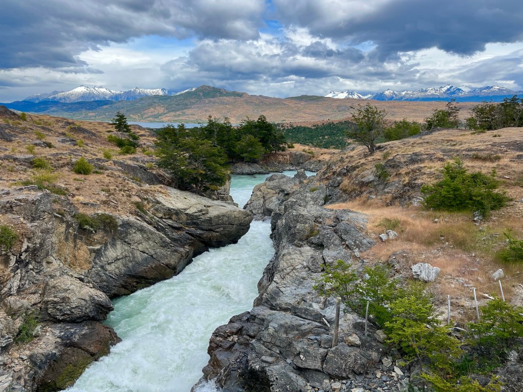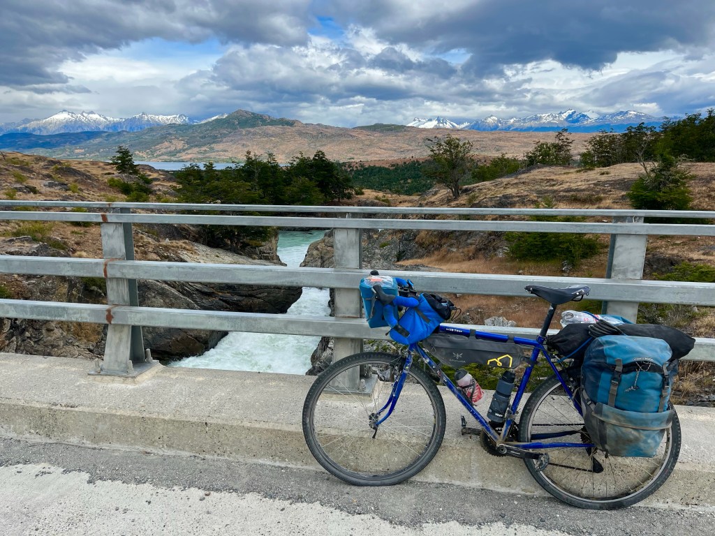We were forced to consider just how full the river was when Desiree’s bike slipped from its resting place against the side of the bridge, causing her cycling gloves to fall off her bag and into the water below. Watching them swirling in a pool underneath the bridge was distressing for her as the gloves had been gifted to her by Felipe, the campsite owner of El Nortino, in Villa Cerro Castillo, a full week before. She tried to see if she could rescue them, but the bank was just too treacherous.