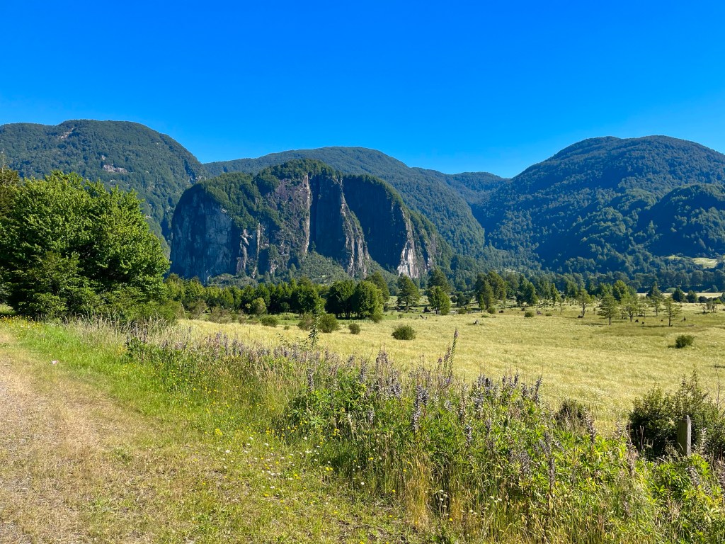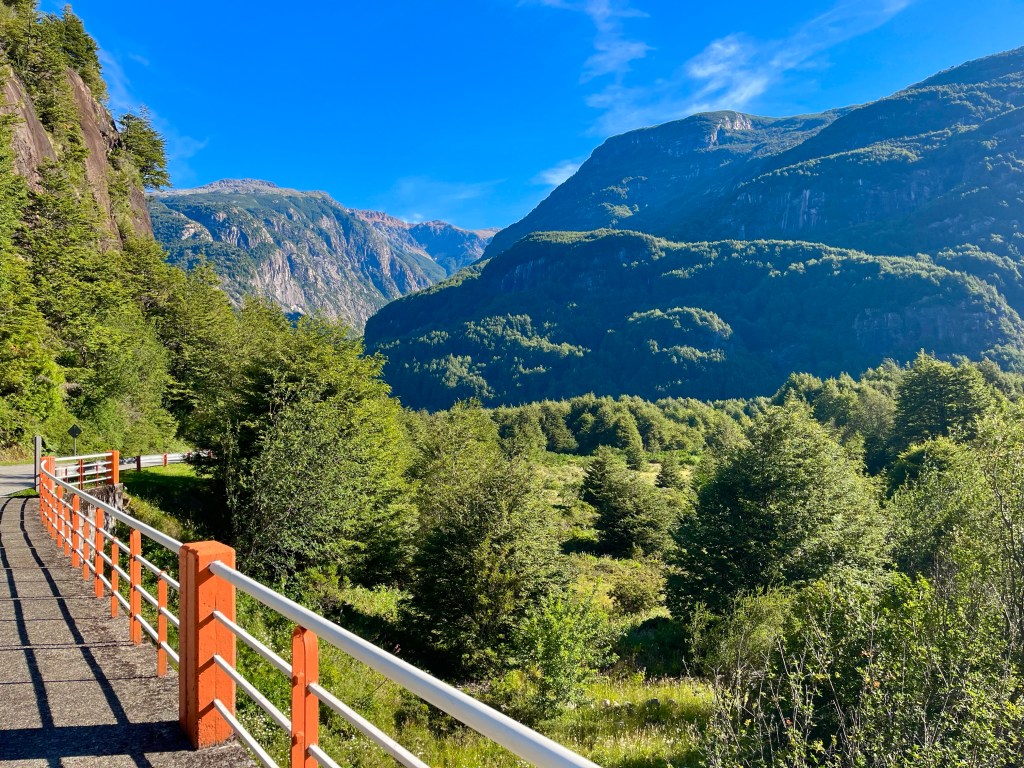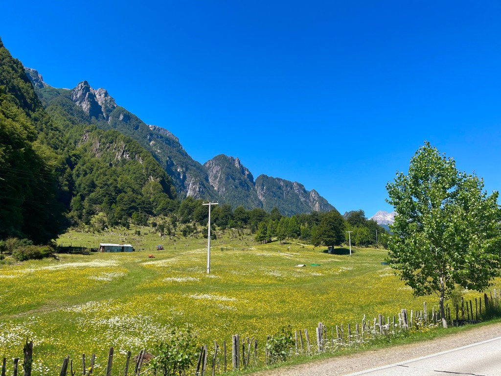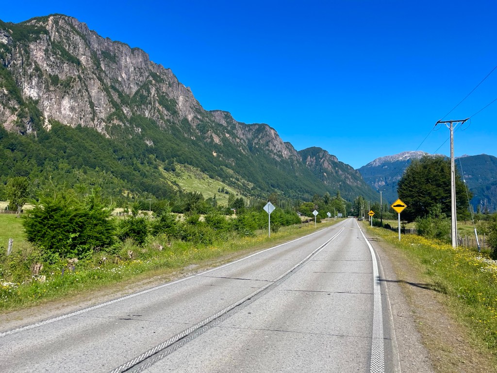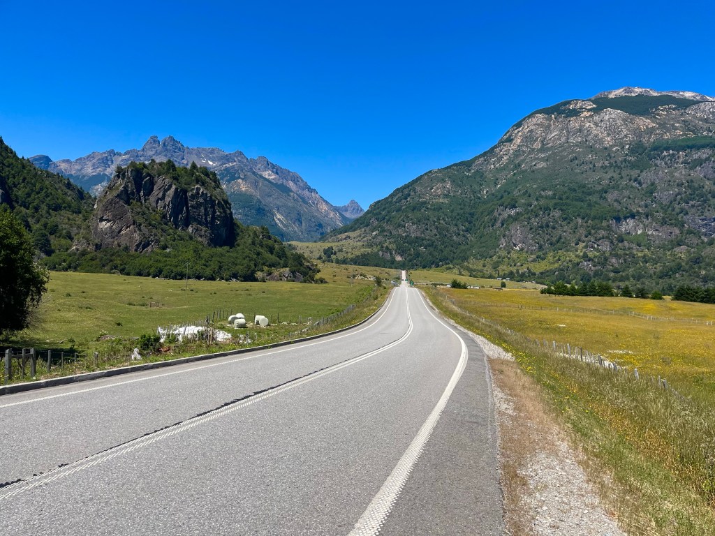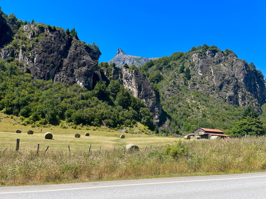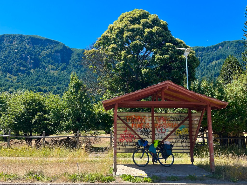 The road was in a high valley along the river when I pedalled the last few miles to Doña Dora campsite at 10 o’clock, only shortly before dark. The camping spot was in sparsely populated forest-land at a farm, and the sole other occupants were an Argentinian couple with a campervan, who were hunkered down in a cosy communal cabin maintaining the fire, it was much appreciated when I was cooking up some pasta in the early hours of the morning.