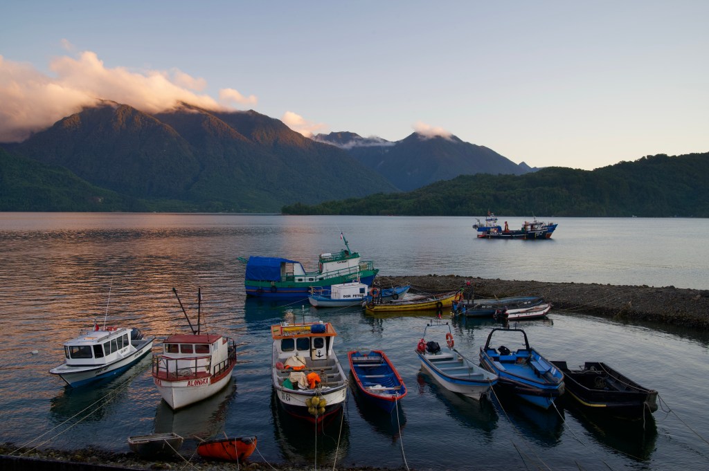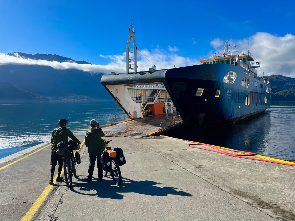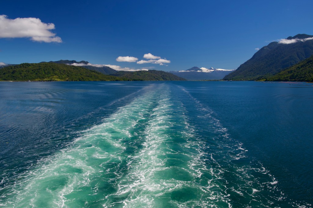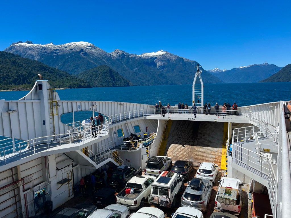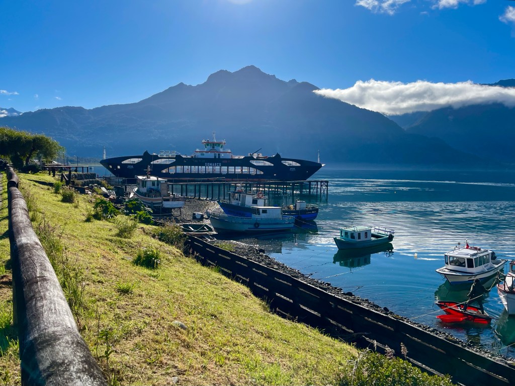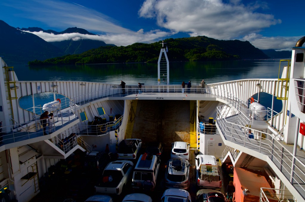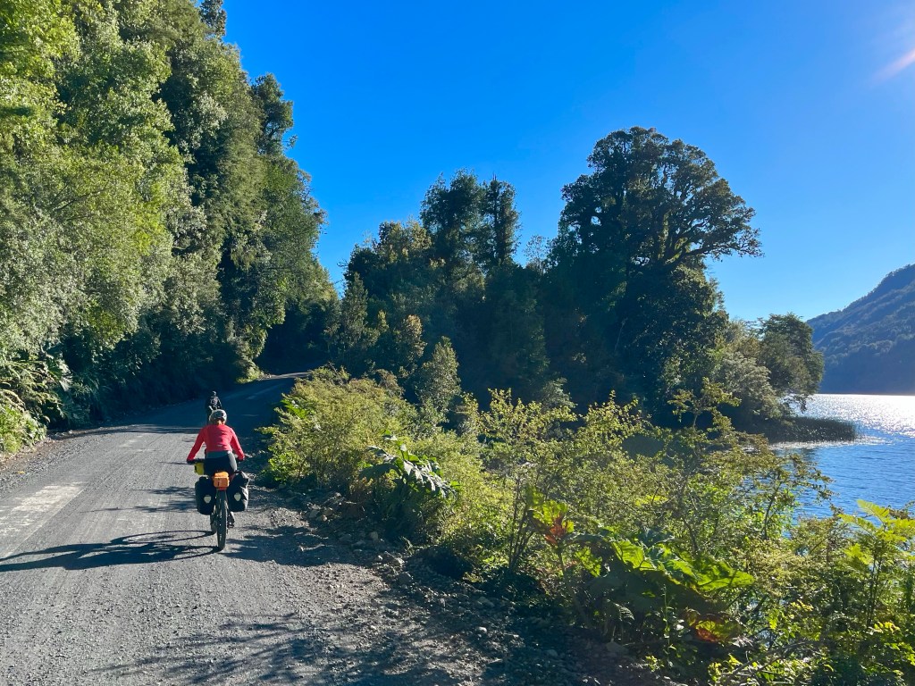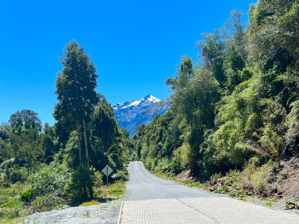 The road undulated along the side of Lago Yelcho, a fine range of mountains towering over the far shore providing a majestic backdrop to the scene.