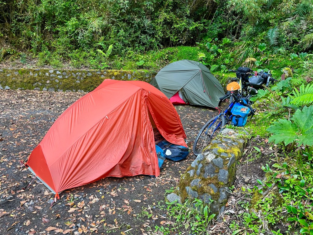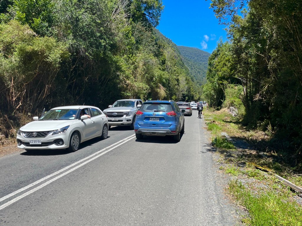 Making in the direction of Campsite El Mañio, my eye was drawn to a food stall offering Empanadas across the street, so I opted to sort dinner first, and deal with where to sleep, after. My empanada arrived quickly, but the papas fritas took a little longer to materialise, by which time a fellow cyclist from Australia, named Andrew, had turned up.