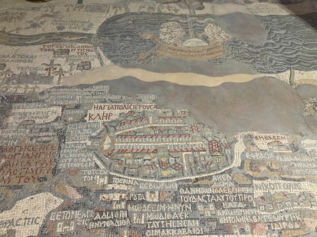Checking into the Black Iris Hotel was a pleasant experience, so I elected to have dinner in the hotel. Being only a little after 4 o’clock, I had some time to spare, so deliberated between the 12 mile return trip over to Mount Nebo, which would afford views of Jerusalem and the Dead Sea, or to make a quick dash down to St George’s Greek Orthodox Church, home to the Madaba Map, a mosaic map known as being the earliest cartographic depiction of Jerusalem and the Holy Land, dating from the 6th Century AD.