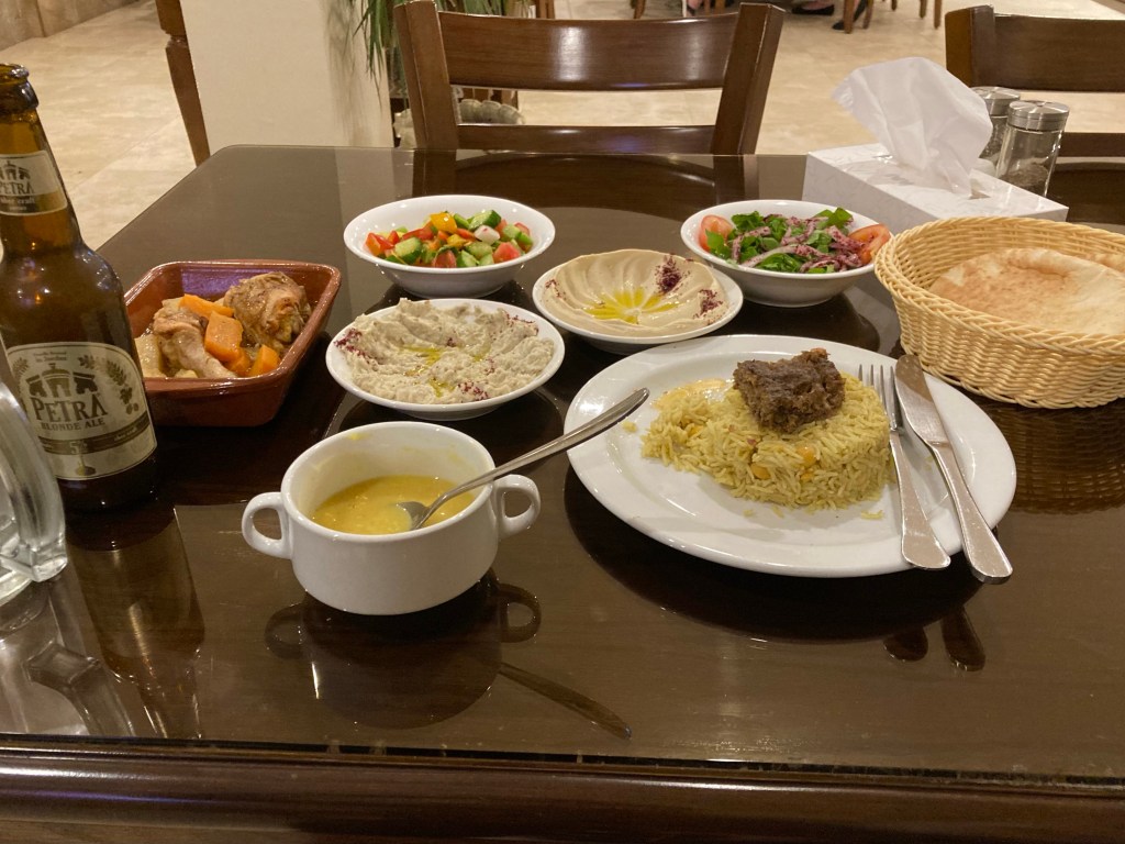 Unsurprisingly I was right, but they did put on quite a feast, with soup, big bowls of hummus and baba ganoush, salads, kofta and rice and a chicken and potato stew. Following that was a big slab of baklava, which was very nice, but I particularly enjoyed washing it all down with a bottle of Petra Blonde Ale, as brewed in Jordan.