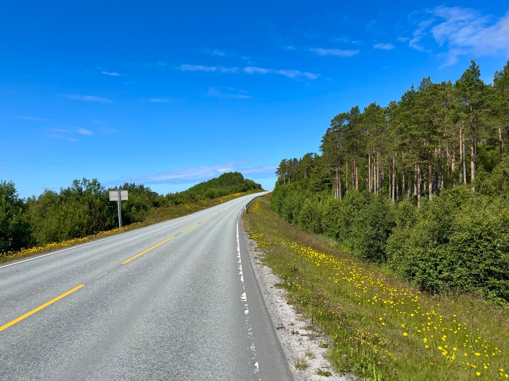I set off up the hill out of Kårvåg, when a couple on heavily loaded tourers rode past me, before my lighter setup saw me move ahead of them again on the next hill. Soon after, there were some roadworks, and we all stopped at the lights for long enough to become acquainted.