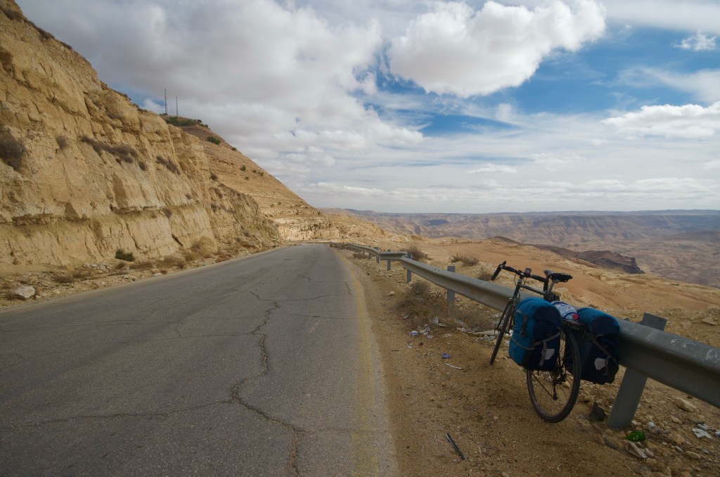 Back on the highway, the road climbed up and over to the start of the most challenging part of the route, the vast Wadi Mujib. The road disappeared over the edge, promising an 8% gradient on its way down. A stunning vista of the valley was revealed, the road snaking far below.