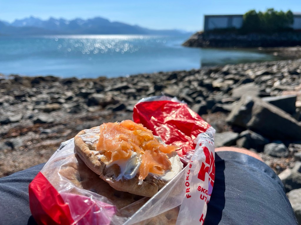 On arriving in Sortland, after 16 miles, it was time for lunch, and taking inspiration from Hans, as he had done from me, I decided to copy his dinner from the night before, picking up some smoked salmon and cream cheese, and pairing them with some bread I was carrying in my pannier.