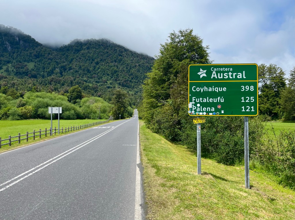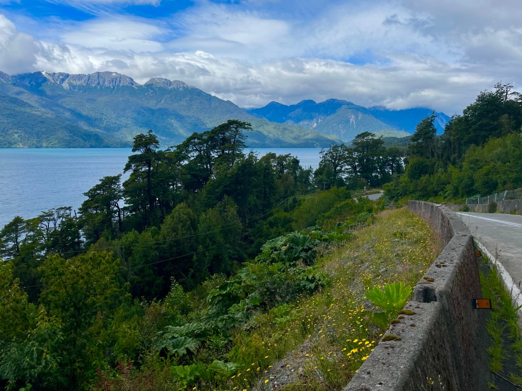 The road undulated along the side of Lago Yelcho, a fine range of mountains towering over the far shore providing a majestic backdrop to the scene.