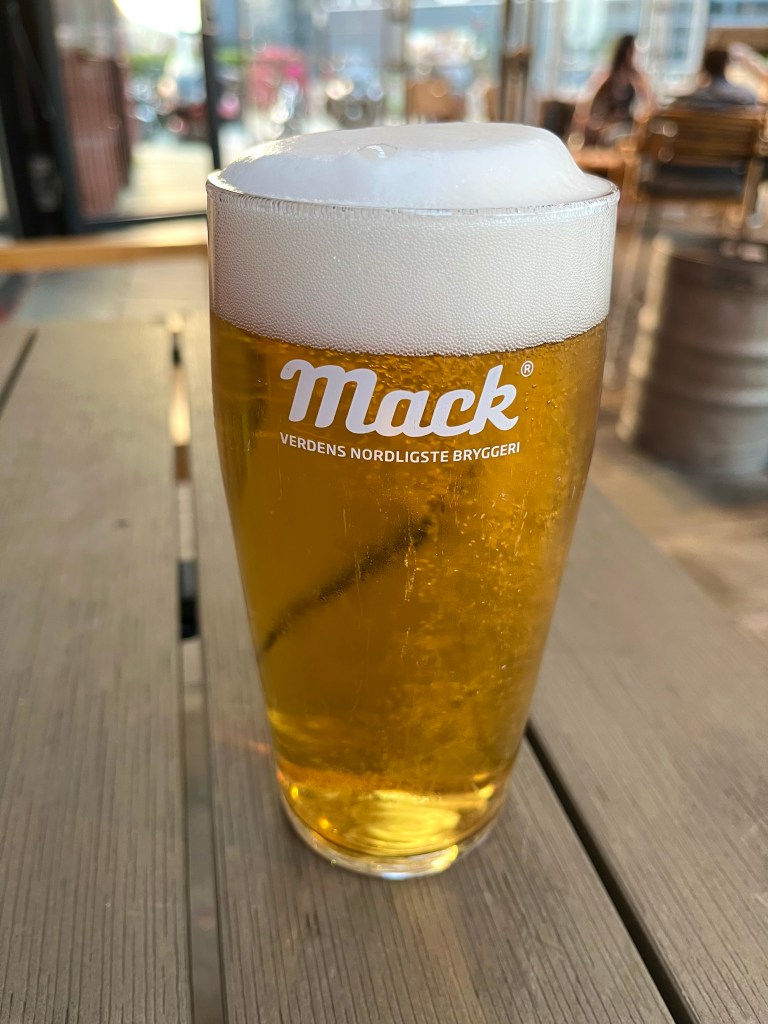 Later in the evening, I dawdled along the waterfront, eventually finding a nice looking beer terrace at the bar, Rorbua, so went inside. Eyes only watering slightly, from the £9.50 beer from Tromsø’s Mack brewery, I tried to forget the £7.30 entry charge entirely. One thing I definitely wouldn’t miss about Norway was the prices.
