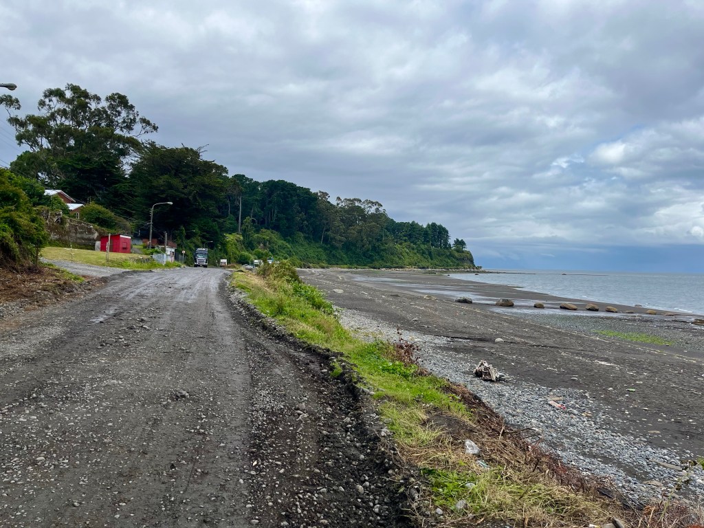 Finally, setting off along the coastal cycle path at just after 2 o’clock, I was now officially pedalling along the Carretera Austral. Less than a mile later the main road climbed steeply over a bluff, and I continued along the coast to avoid it, being passed by a couple of cyclists going the other way, which gave me hope that this could be a passable route, a hope that soon evaporated when the road turned to dirt a few metres later, and even more so when I encountered a large puddle of standing water covering the entirety of the road.