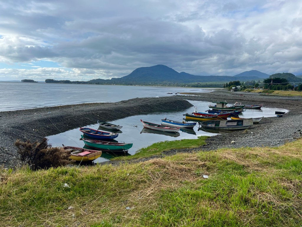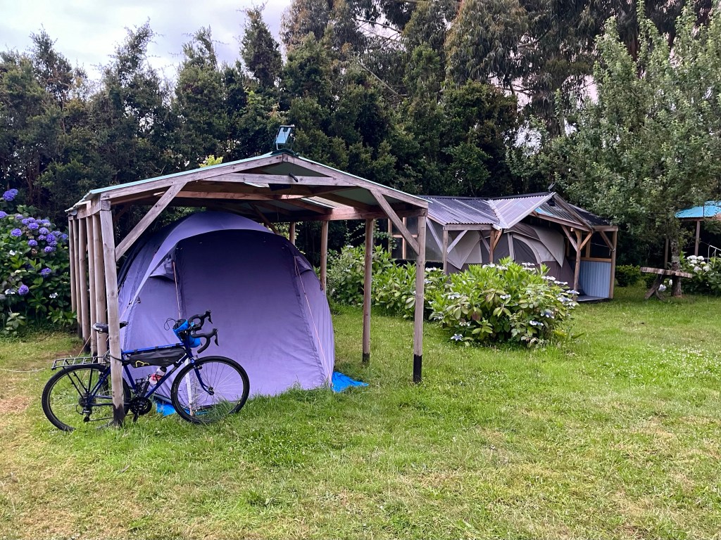Disembarking at Caleta Puelche, it was only 4 km to what Google Maps showed – mysteriously – as ‘Camping y Glamping’, and our hearts sank when we arrived and it was deserted, but we made good use of Pablo’s native Spanish language skills to call the number in the window, and the host rushed along to make us feel at home.