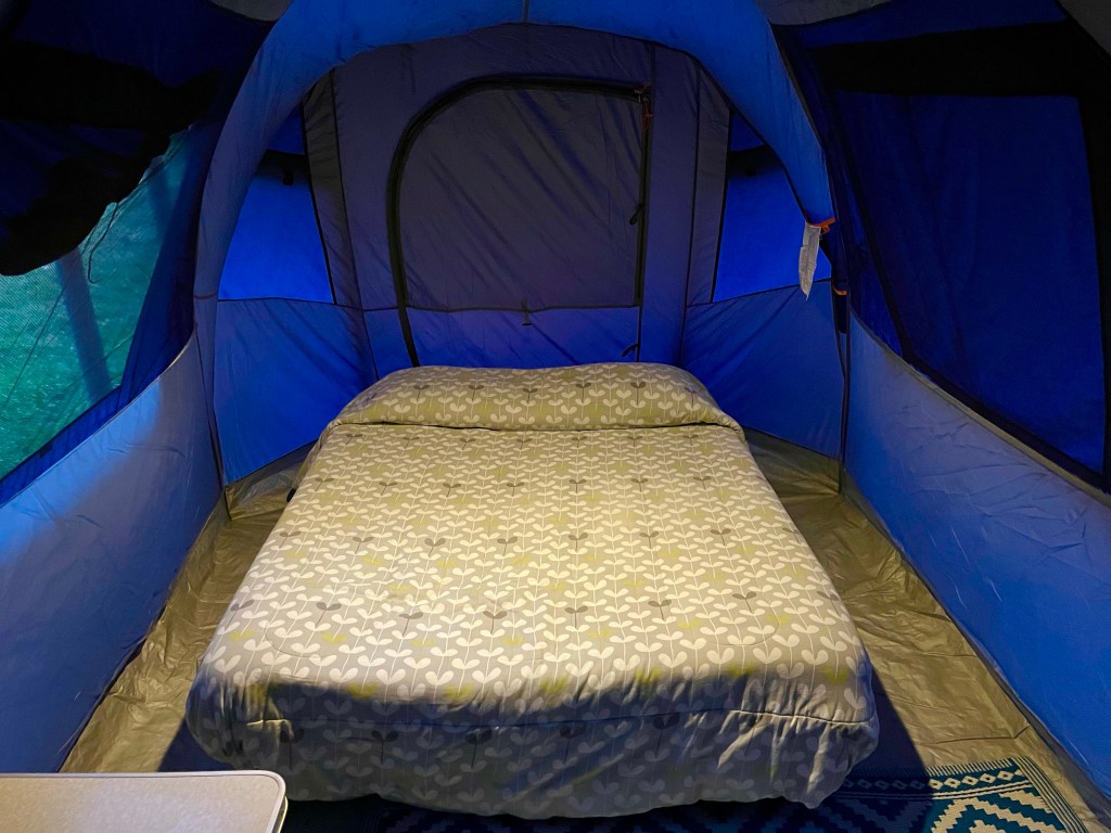 In the end, we all decided that our tents could wait for another day, and the ‘glamping’ setup would do the trick, in this case, a large tent with bed, lights, and power. He also offered to make us burgers for dinner, so my stove could also remain happily ensconced within my panniers.